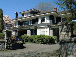 This unusual 1910 home features a pair of twin towers with dome roofs on either side of the grand entrance porch, and an outstanding wrought iron fence imported from Glasgow. In 1992, owner Elizabeth Wlosinski willed the home to the City. It is now the home of Canuck Place, a hospice for children.